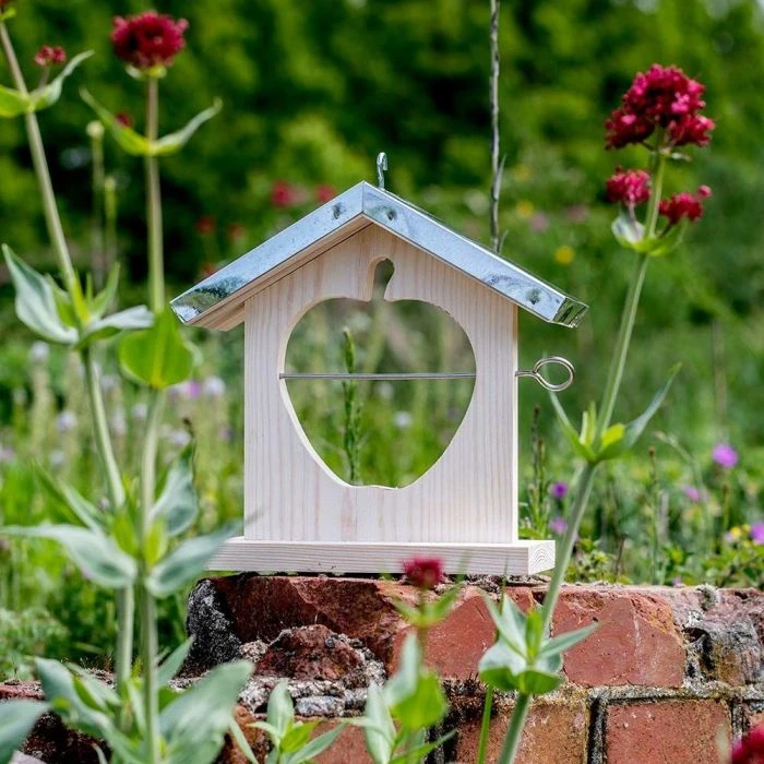 The Tampere apple feeding system is made of wood with a pale white finish. The roof is elegantly covered with a metal sheet. This feeder is easy to use, simply remove the pin on one side, slide an apple or a giant fat ball on it and put the pin back. Give the Tampere a nice quiet place in the garden and enjoy the birds that come to it.